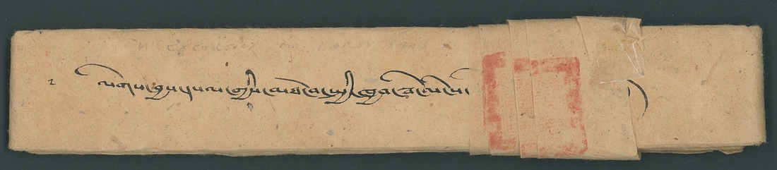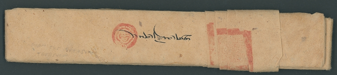 1924 (c.) scarf cover with contents, the letter is folded with the original sealing wrapper with square handstamp (28x28 mm) with two lines of Horyig script and with the red of the Panchen Lama's Secretary (Dawson 30); the wrapper is closed with the reddened wax seal with character at foot and three circles or crescents at top with 1912 1/6 tr. apple green (shiny ink) tied by indistinct Lhasa postmark; with the original silk scarf. An unusual and interesting complete letter. Photo