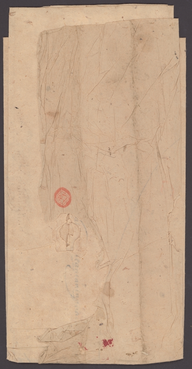 1845 (c.) seventh Panchen Lama shirt letter/wrapper bearing a fine strike of the Panchen Lama's 35mm square Seal of Heaven and Earth (Dawson 26) and, on the exterior, his small seal. The contents from the Regent in Lhasa to the King of Nepal regards the presentation of horses. The Panchen Lama acted as Regent between 18th September 1844 to 31st May 1845. A scarce letter from this short period. A few holes, not affecting the seal or the message. Photo