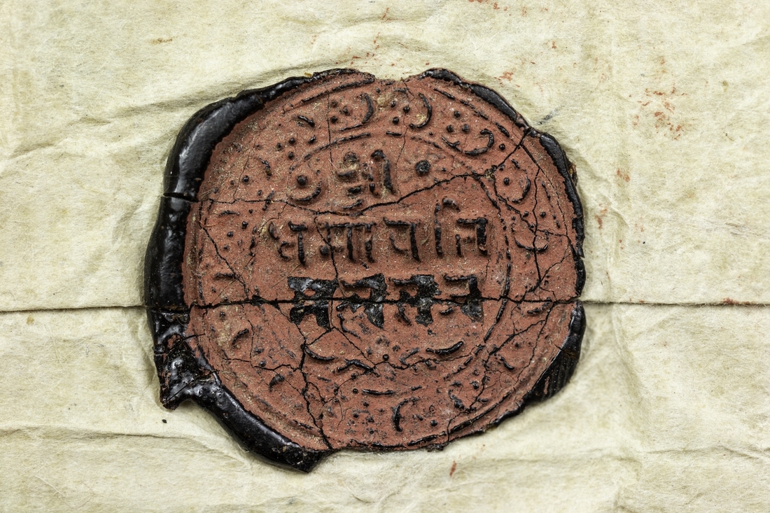 1930 (c.) a fine impression of his red wax seal on native scarf wrapper addressed to the King of Nepal; the seal with cracks in places. Very rare. Photo