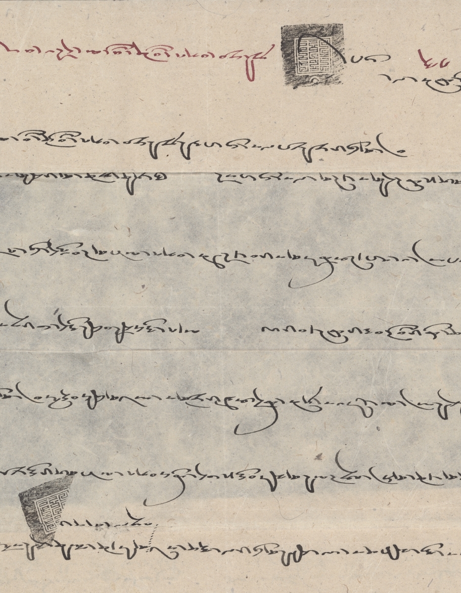 1950 copy of Tibetan Government's letter delivered to the U.S. ambassador in India with typewritten English translation on one side. The letter is a reaction to the Peking government's announcement of offering autonomy to Tibet. With the expectation of communist aggression the request for arms and assistance from India and U.S.A., in particular are funds in U.S. dollars, weapons including field artillery and machine guns and field service radios. From Kalon Lama Ramps, Foreign Minister and closed with handstamp in black (20x20 mm) with three lines of Horyig script and sun and crescent at top. A remarkable document. Photo