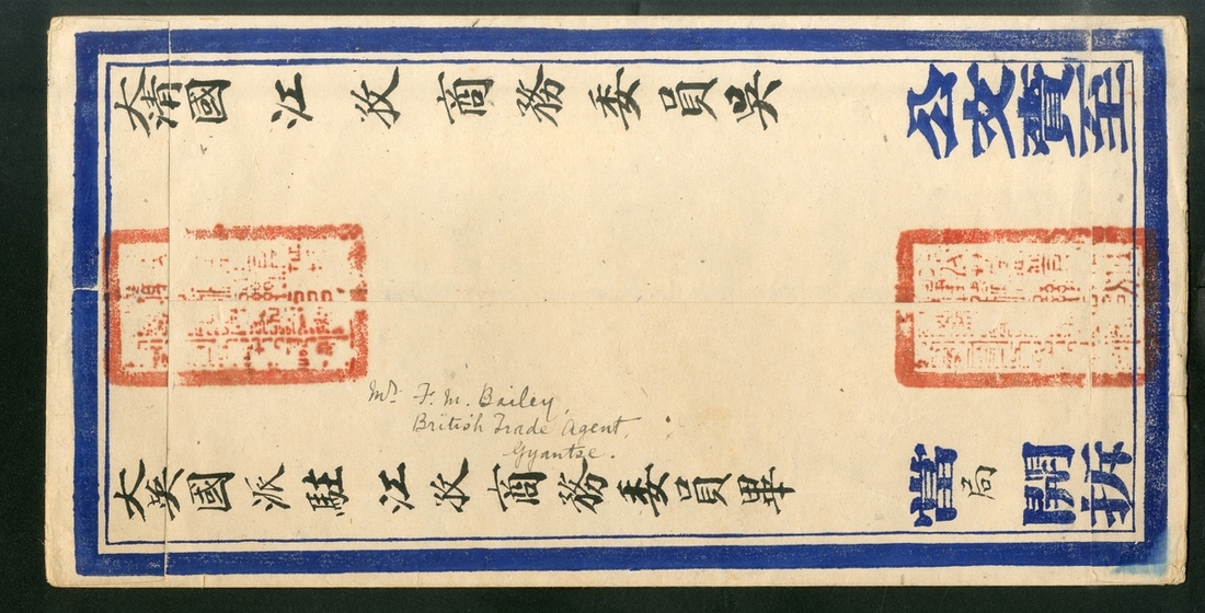 1908 I-chang cover with enclosure to F.M. Bailey, British Trade Agent, Gyantse, the cover bearing three strikes of the red seal with a further two on the letter; superb condition. Photo