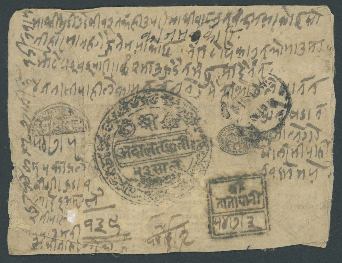 Kuti Court: 1897 (Oct.) native envelope from the Kuti Court to Kathmandu bearing, on the reverse, the large and ornate official seal of the court in black and a fine strike of the boxed Tatapani Customs cachet with manuscript date insertion (scarce), Chautra transit and Dhulikhel negative c.d.s. transit. This was carried by Nepalese couriers to the nearby town of Tatapani from where it was posted free of charge. A good cover. Photo