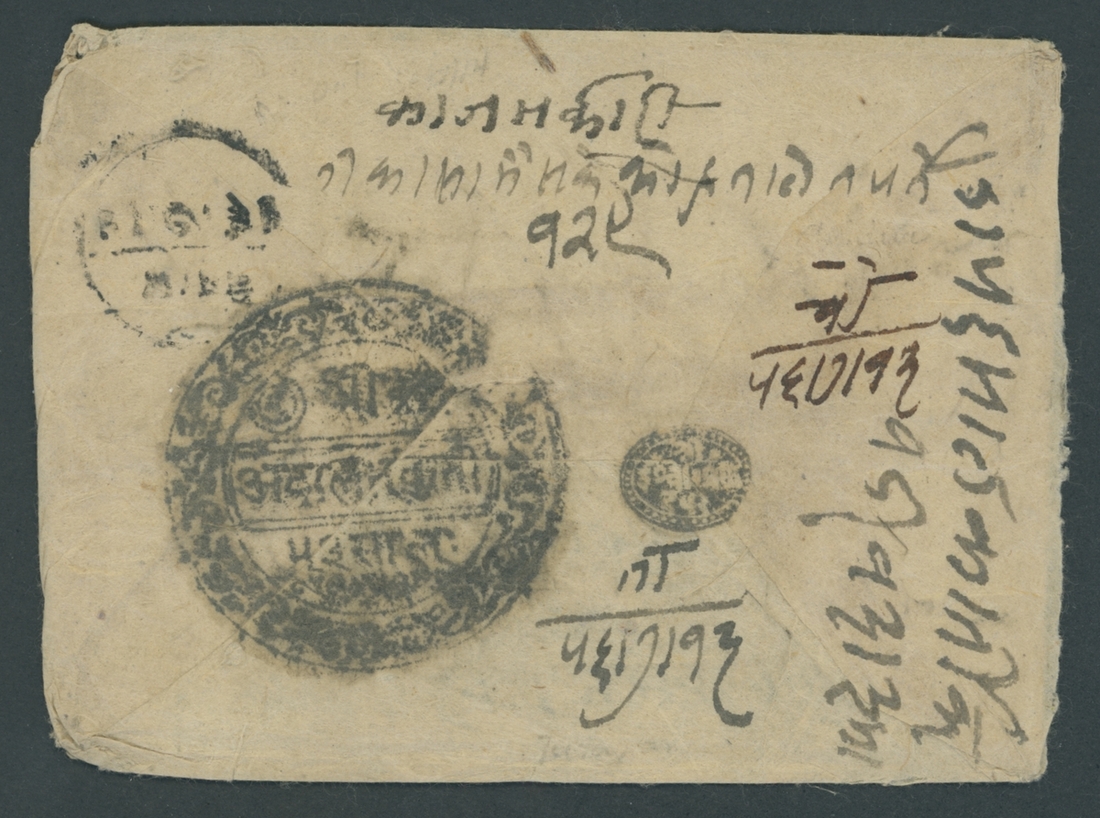 Kuti Court: 1899 (Oct.) stampless official cover to Katmandu bearing the large ornate seal of the Kuti Court in Tibet, carried by runner and put into the Nepalese post at Chautara; apparently at this time the Tatapani Post Office was bypassed; scarce. Photo