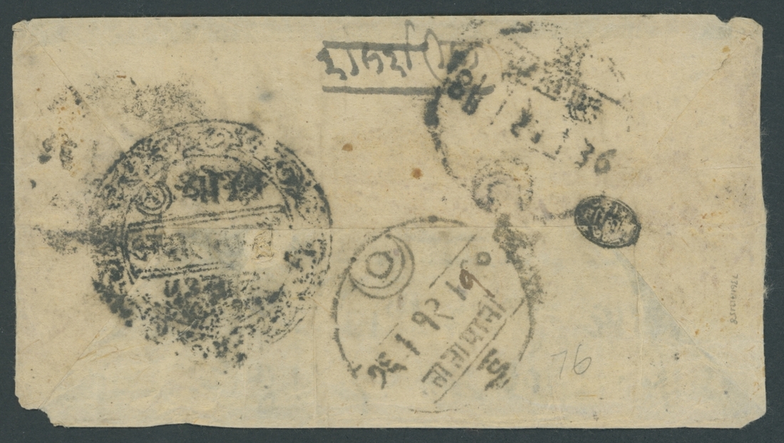 Kuti Court: 1920 small stampless envelope to Katmandu bearing, on the reverse, the large fancy seal of the Kuti Court, carried by runner and put into the Nepalese post at Tatapani with sun in crescent datestamp and with Chayata transit and small private seal. Photo
