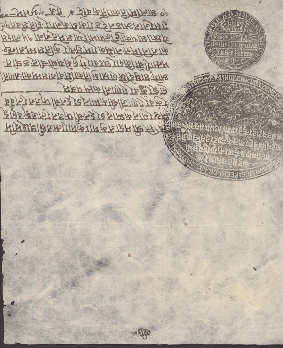 1853 (Oct.) an Official document instructing Customs and Security authorities from Kathmandu to Kuti that Nayek Ramsunder, the Nepalese representative at Lhasa, should pass without incident. Bears superb strikes of the impressive seals of the Nepalese Prime Minister, Jang Bahadur. A rare and handsome document. Photo