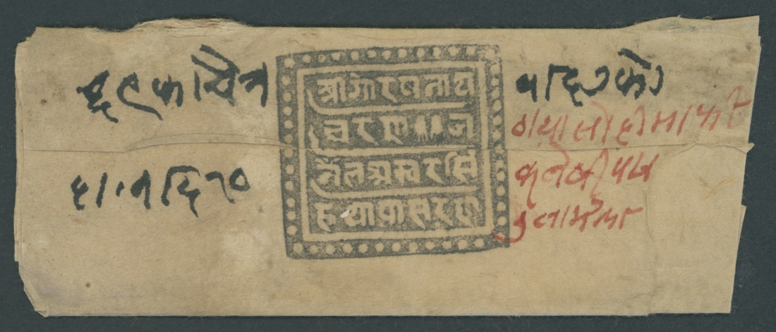 General Amar Singh Thapa: 1813 (Apr.) letter to General Bhim Sen Thapa closed with a fine strike of his seal (34x32 mm) in black; a small fragment missing at side. Photo