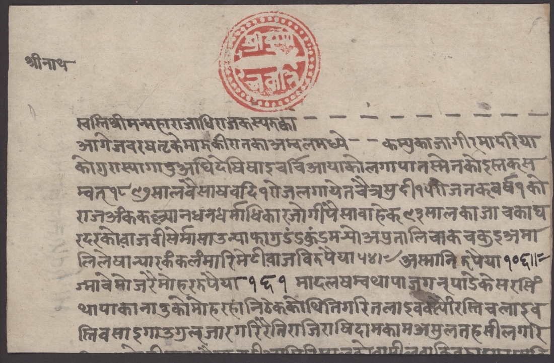 1840 (Feb.) a royal document with the red dagger seal of King Rajendra and signed by Fatya Jung Shah; the contents regard a land donation