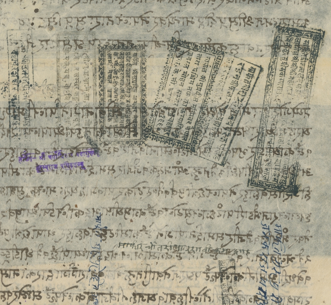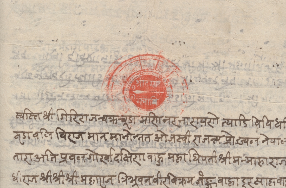 1940 (c.) an important Royal document featuring the Royal Seal of King Pritwi Bir Bikram (introduced in 1906), engraved with the twelve signs of the zodiac, struck in vermilion, the reverse bears the large rectangular seals of Prime Minister Juddha Shamsher, C-in-C Padma Shamsher and generals Mohun, Baber, Kaiser Sham and one other. These handstamp were only applied on important Royal documents. Fine and scarce. Photo