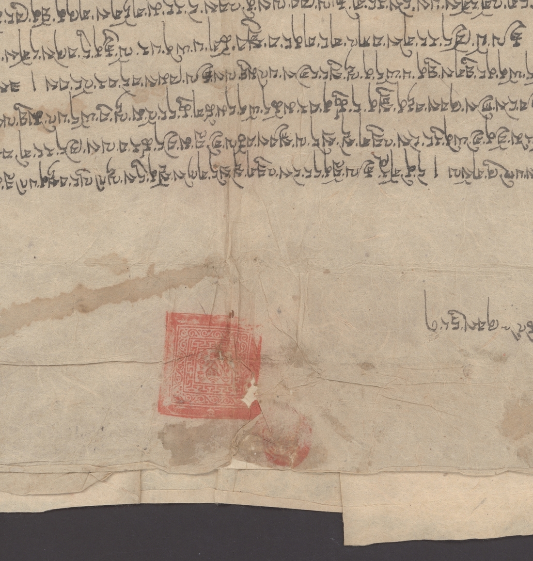 1862 letter from the Druk Desi-Regent to the King of Nepal closing with a good strike of the elaborate square seal (35x37 mm) struck in red, his personal seal on the outside has been covered by a reinforcement repair. The letter is a desperate appeal for help.