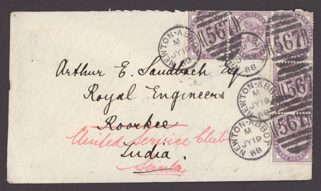 1888 (19 July) Sandbach envelope to Roorkee and redirected to Simla, bears G.B. 1881 1d. lilac (5) tied by Newton Abbot duplex, the reverse bearing Bovey Tracey (19.7), Sea Post Office (26.7), Roorkee (8.8) and Simla (9.8) c.d.s.; some of the adhesives just overlapping the edge of the envelope