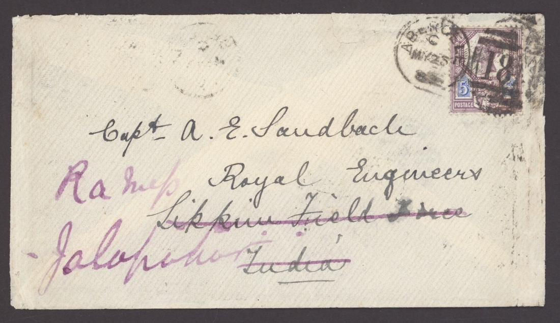 1889 (25 May) Sandbach envelope to Sikkim Field Force and redirected to Jalapahar bearing G.B. 5d. purple and blue tied by Abergele duplex, the reverse bearing Sea Post Office (3.6). Darjeeling (13.6) and Jalapahar (14.6) c.d.s.; some peripheral wrinkling. Photo