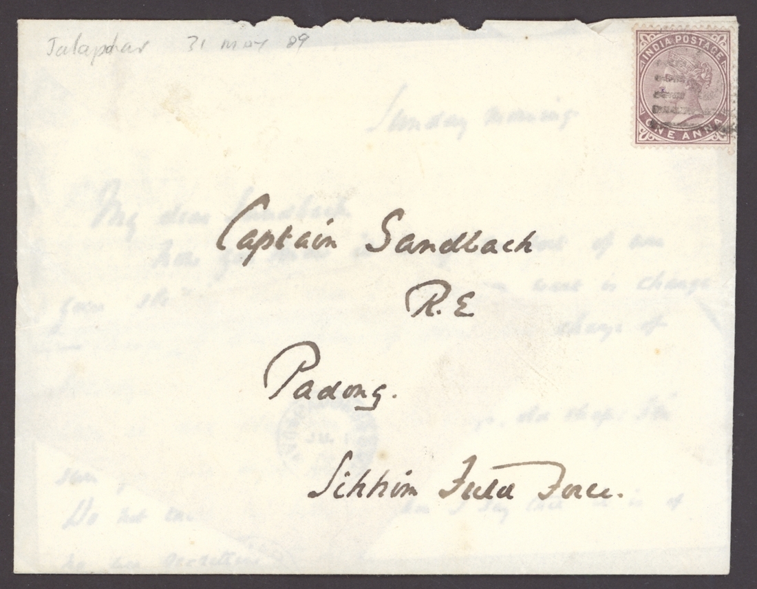 1889 (31 May) Sandbach envelope to Sikkim Field Force, Padong bearing India Q.V. 1a. cancelled by bars postmark, the reverse bearing Jalapahar despatch c.d.s.; horizontal fold