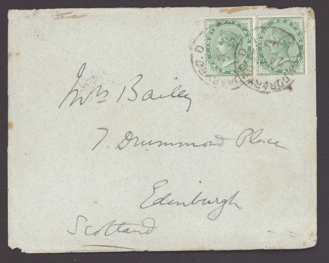 Temporary P.O. "D": 1903 (25 May) envelope to Mrs Bailey in Edinburgh bearing India ½a. pair tied by "