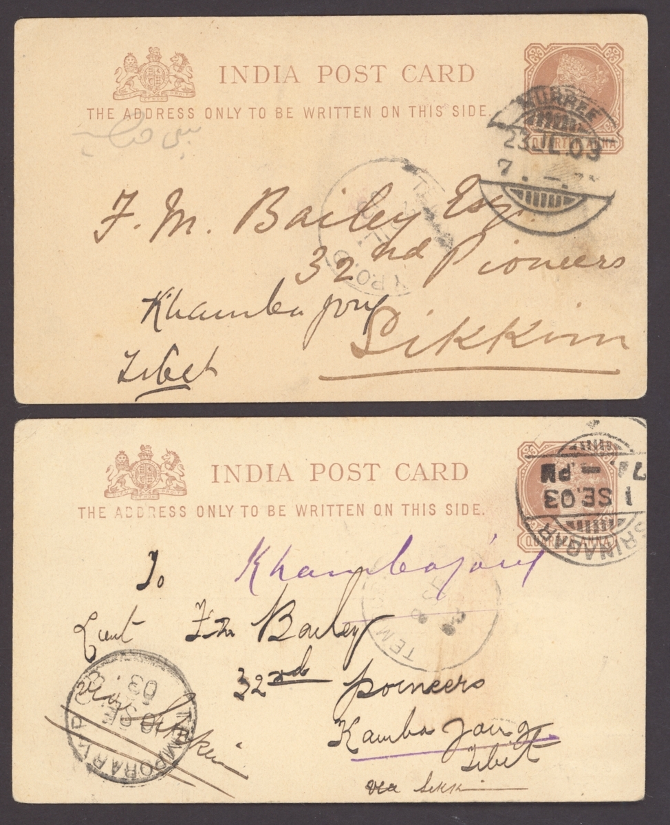 Temporary P.O. "D": 1903 (23 July) India ¼a. stationery card to F.M. Bailey in Khamba-Jong cancelled by Kuree despatch c.d.s. and showing a light strike of "