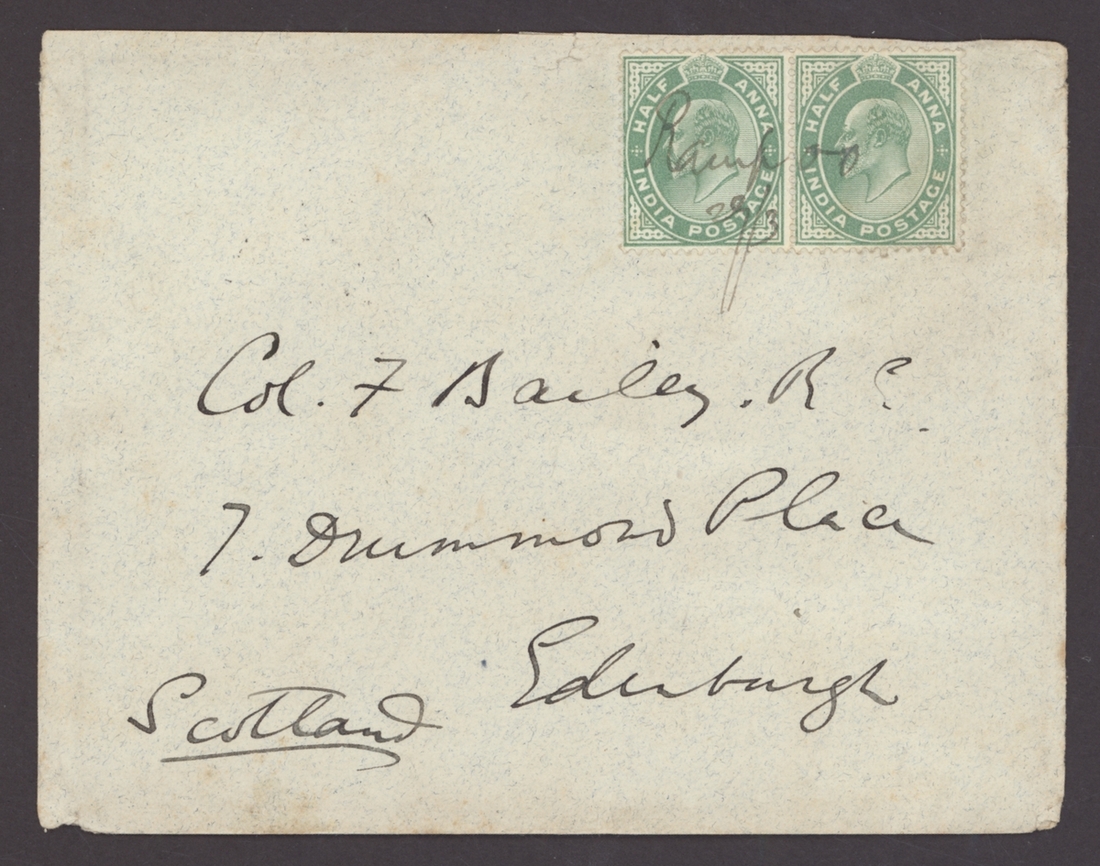 Manuscript "Rangpoo": 1903 (29 Mar.) envelope to Col. F. Bailey in Edinburgh bearing pair of India K.E.VII ½a. tied by manuscript "rangpoo 29/3" cancellation in black ink, the reverse bearing the crest of the Punjab Pioneers and Edinburgh & Newcastle Sorting Tender c.d.s. (19.4). A magnificent and highly important cover used on the first day the post office was opened by the Frontier Mission. Photo