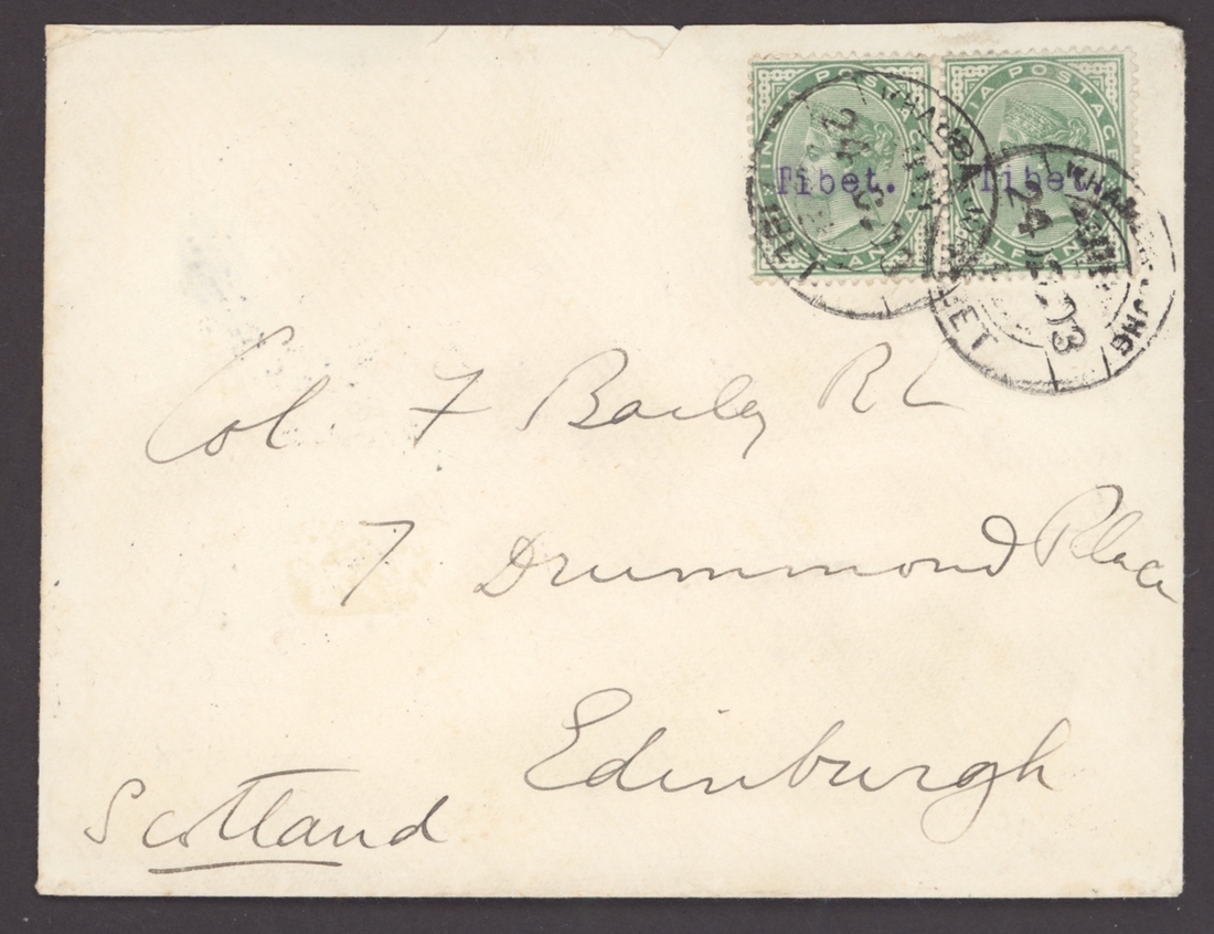 Typewritten "Tibet": 1903 (24 Oct.) envelope to Col. Bailey in Edinburgh bearing pair of India Q.V. ½a. with typewritten "Tibet." in violet tied by Khamba-Jong type B2 c.d.s., the reverse bearing a fair strike of "