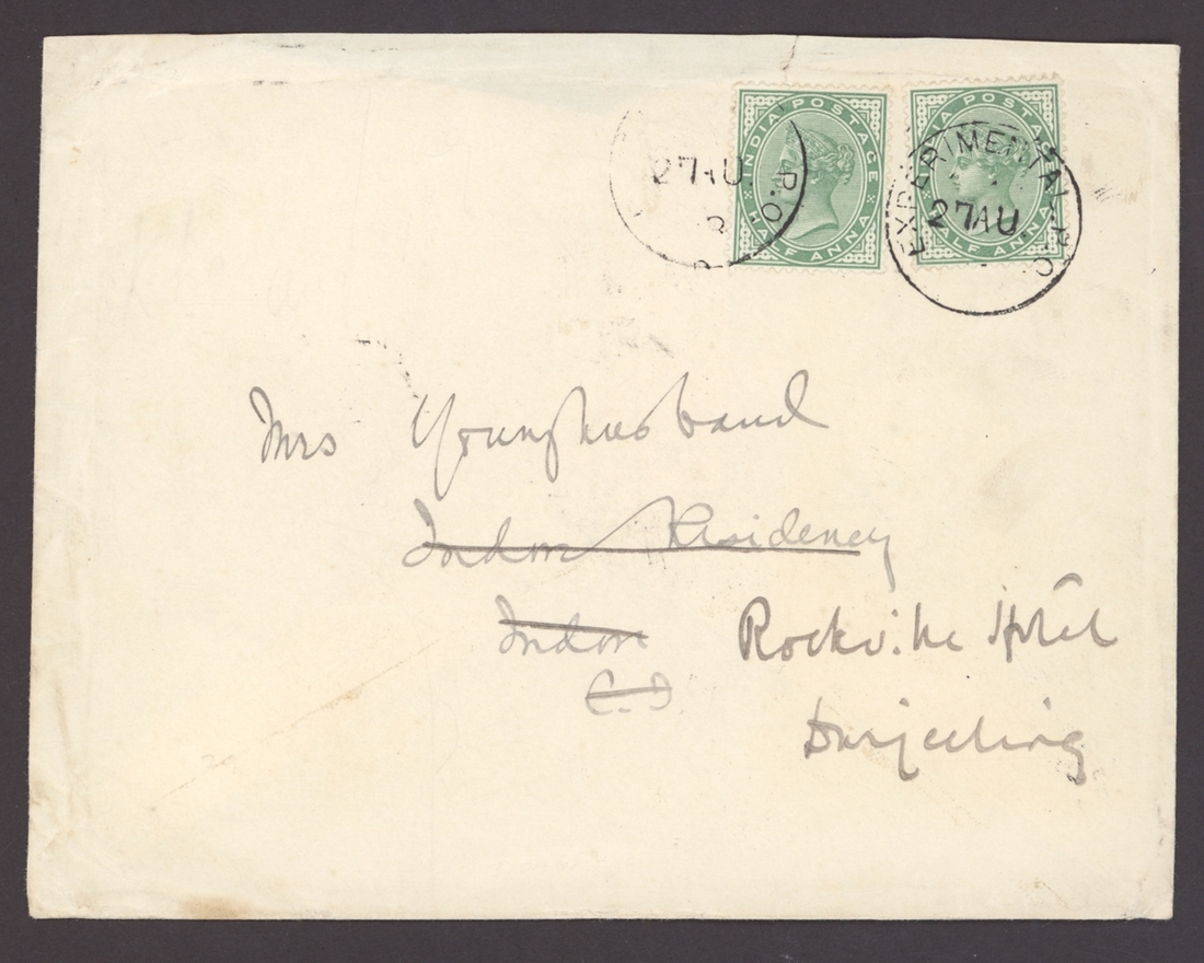 Experimental P.O. C.46: 1903 (27 Aug.) envelope to Mrs Younghusband in Indore, redirected to Darjeeling bearing India Q.V. ½a. (2) tied by fair strikes of the "