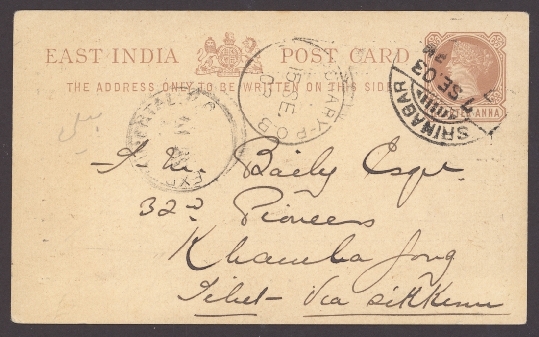 Experimental P.O. C.46: 1903 (7 Sept.) India Q.V. ¼a. stationery card to J.M. Bailey, Khamba Jong "Via Sikkim" cancelled by Srinagar despatch c.d.s. and with good strikes of "