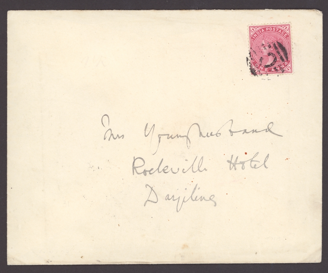 "C" in Barred Circle: 1903 (1 Sept.) envelope to Mrs Younghusband in Darjeeling bearing India Q.V. 1a. tied by a good strike of "C" in bars, the reverse bearing a good strike of "