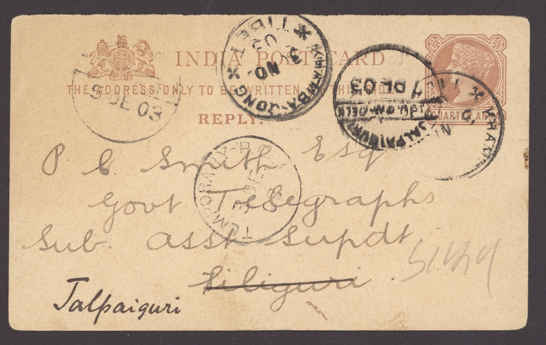 Khamba Jong: 1903 (30 Nov.) India Q.V. ¼a. stationery card to Siliguri and redirected to Jalpaiguri cancelled by a fair strike of Khamba-Jong c.d.s. (Waterfall 3) with a better strike alongside with "