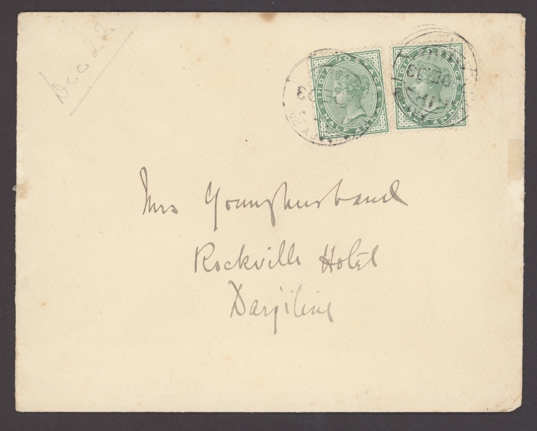 Temporary P.O. 1: 1903 (21 Dec.) envelope to Mrs Younghusband in Darjeeling bearing India Q.V. ½a. (2) tied by good strikes of the double-circle "