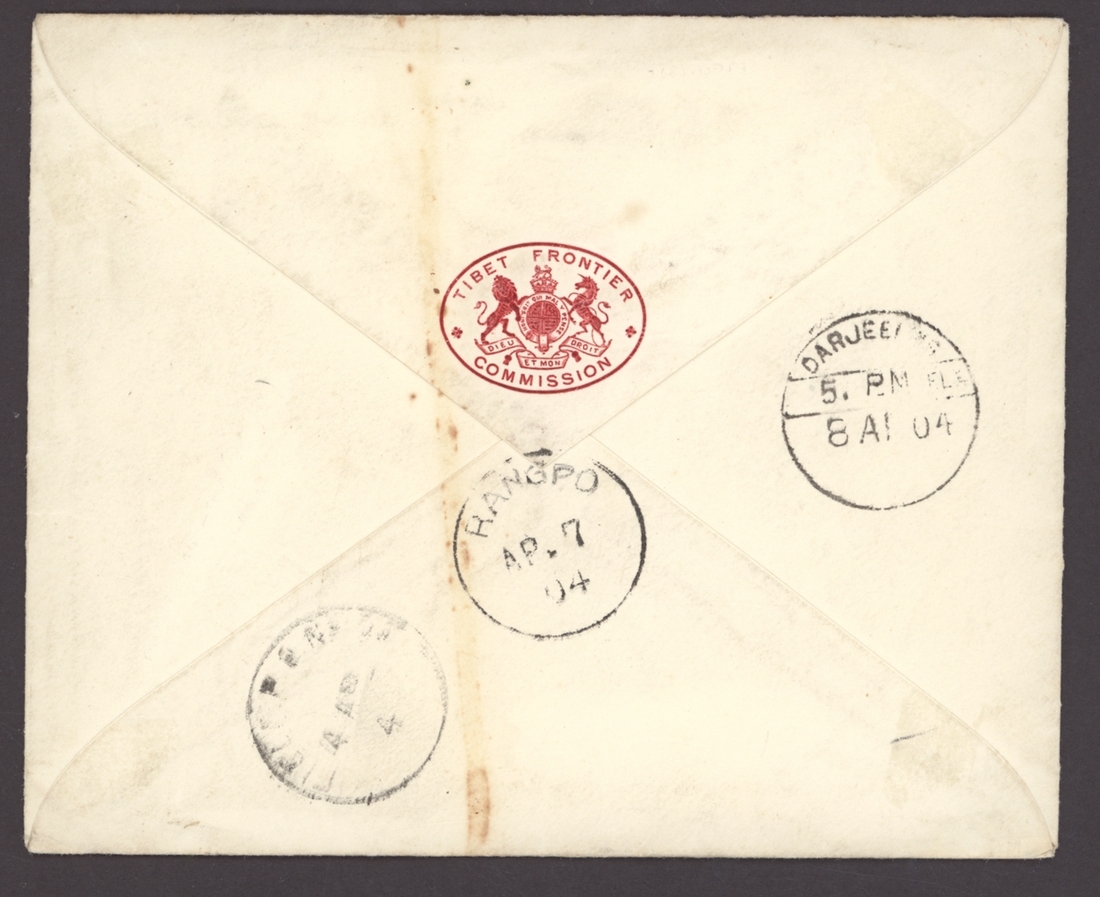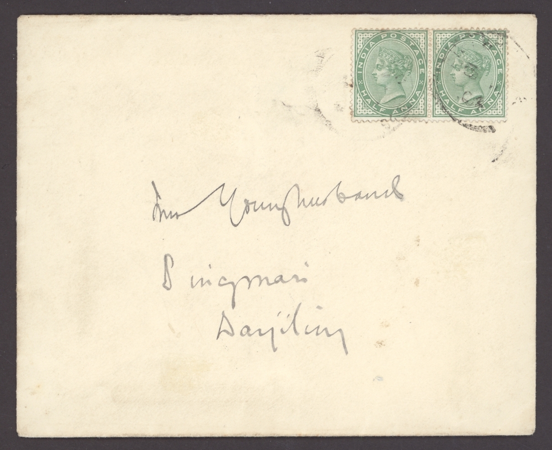 Field P.O. No.25: 1904 (3 Apr.) Younghusband envelope to Darjeeling bearing India Q.V. ½a. pair tied by indistinct strikes of the type B2 "