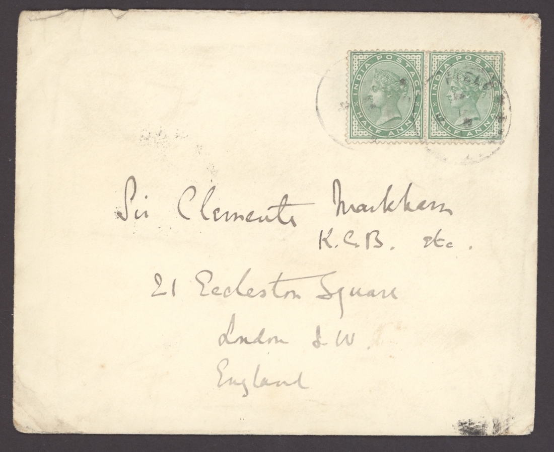 Field P.O. No.26: 1904 (4 Apr.) Younghusband envelope to Sir Clement Markham in London bearing India Q.V. ½a. pair tied by light but indistinct strikes of type B1 "