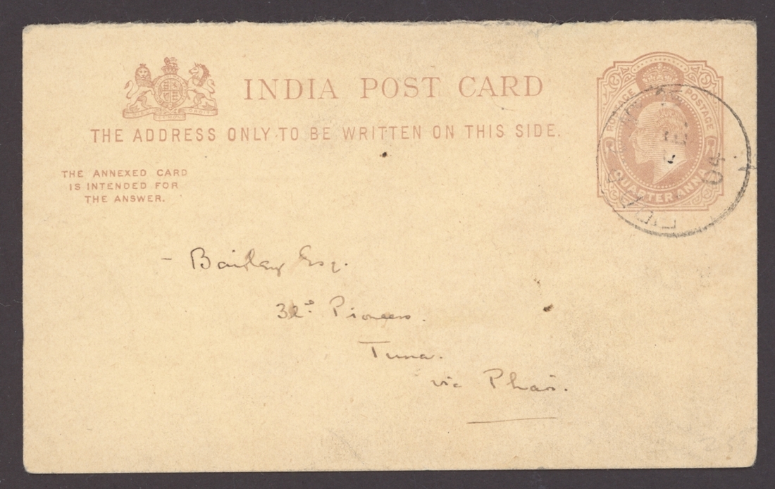Field P.O. No.27: 1904 (27 Feb.) India K.E.VII ¼a. stationery card to Tuna "via Phari" cancelled by a faint strike of type B1 "