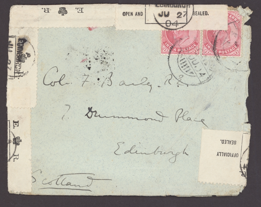 Field P.O. No.31: 1904 (6 June) Bailey envelope to Edinburgh bearing India K.E.VII 1a. (2) tied by type B2 "