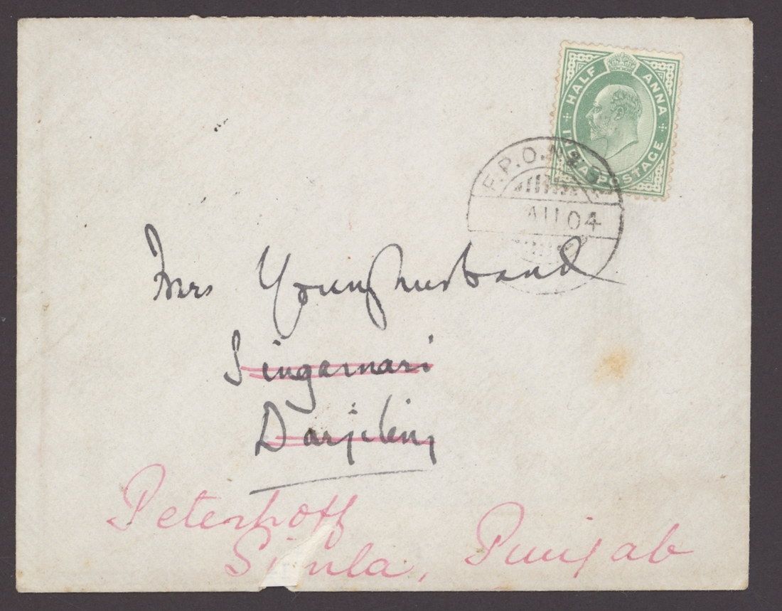 Field P.O. No.32: 1904 (Aug.) envelope to Mrs Younghusband in Darjeeling and redirected to Simla bearing India K.E.VII ½a. tied by a good strike of the type B2 "