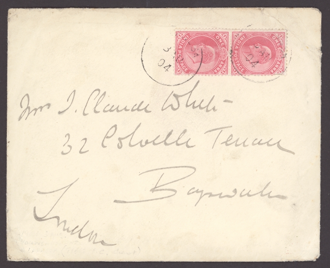 Lahssa: 1904 (3 Aug.) envelope to Mrs Claude White in London bearing India K.E.VII 1a. pair tied by neat strikes of the despatch c.d.s., the reverse bearing the arms of Tibet Frontier Commission and Base Office (19.8) c.d.s. Used on the first recorded date of this postmark. Waterfall 37. Photo