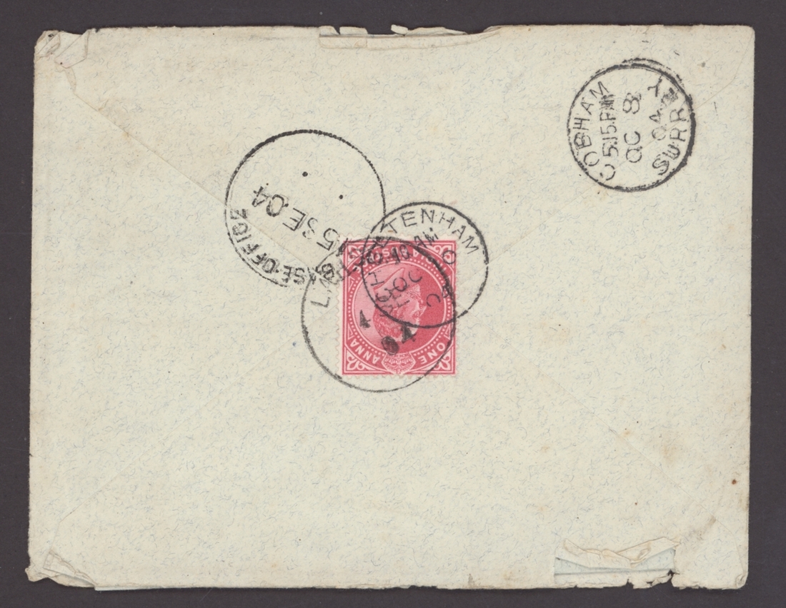 Lahssa: 1904 (1 Sept.) envelope to Surrey marked "Tibet Mission Force - No stamps available" which has been crossed through and "Stamped" added, the reverse bearing India K.E.VII 1a tied by the despatch c.d.s., Base Office (15.9), Cobham (8.10) and Cheltenham (10.10) (where it had been redirected) c.d.s. With original letter from Lhasa which gives some interesting details of life there. Waterfall 37. Photo