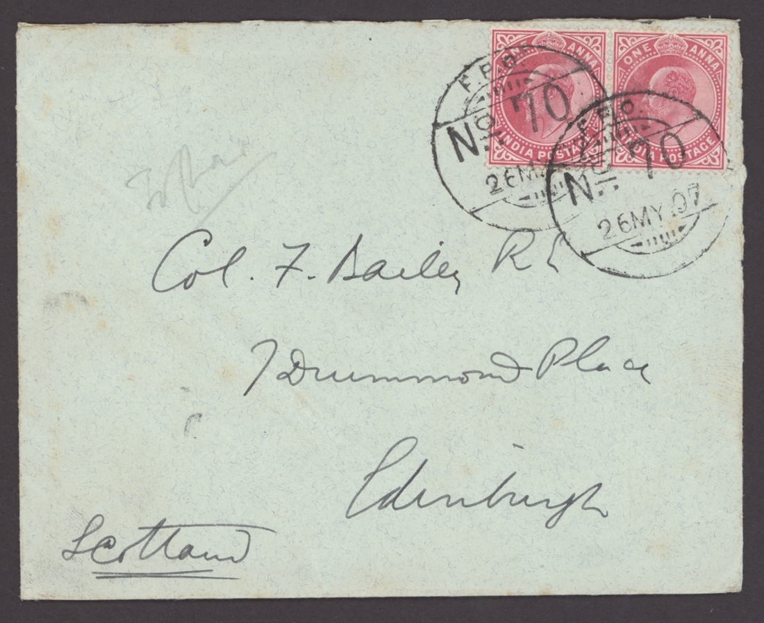 Field P.O. No.70: 1907 (26 May) envelope to Col. Bailey in Edinburgh bearing India K.E.VII 1a. pair tied by fine strikes of the large "