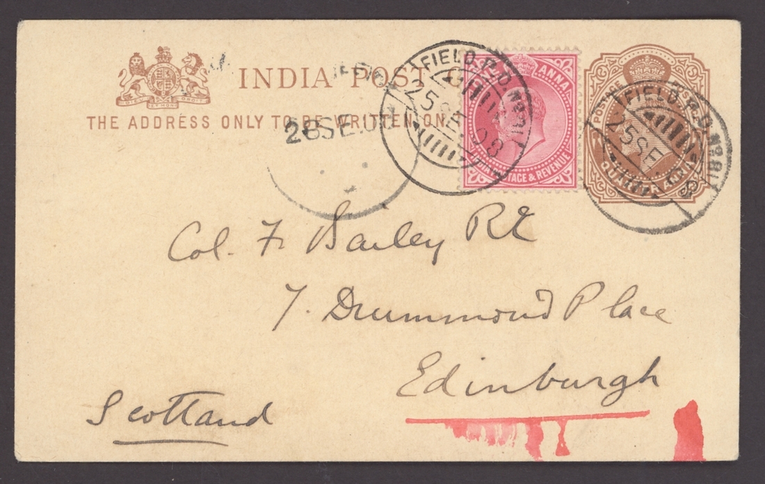 Field P.O. No.81: 1908 (25 Sept.) India ¼a. stationery card to Col. Bailey in Edinburgh, uprated 1a. and cancelled by fine strike of the type B2 "