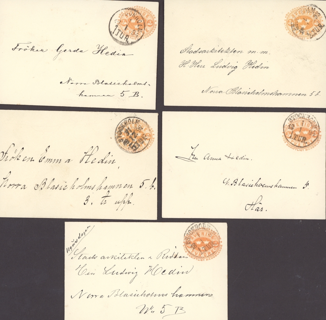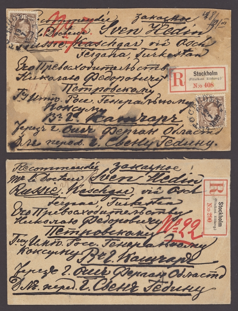1899 two incoming envelopes registered to Sven Hedin in Kashgar bearing 60ö. frankings tied by Stockholm c.d.s. with red and black registration label, the reverse bearing Osh Ferghana/Post Telegr Office c.d.s. in bluish, one with additional Moscow transit. Sent by his father, they are addressed, via Osh, to the Russian Consul-General Perrovsky in Kashgar for transmission to Sven Hedin. Manuscript numbers "No.7" and "No. 22" in red ink; one with slight water staining. Also a group of Sweden stationery envelopes to his father Ludwig (2) and sisters Anna, Gerda and Emma. Photo