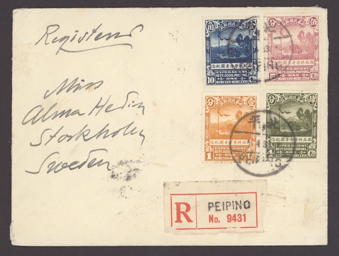 1933 (5 Apr.) envelope registered to Alma Hedin in Stockholm bearing the set of four of the North-West Scientific Expedition stamps tied by Peking c.d.s. with the red on white registration label alongside, there is an additional 30c. franking on the reverse and is signed "Sven Hedin". Photo