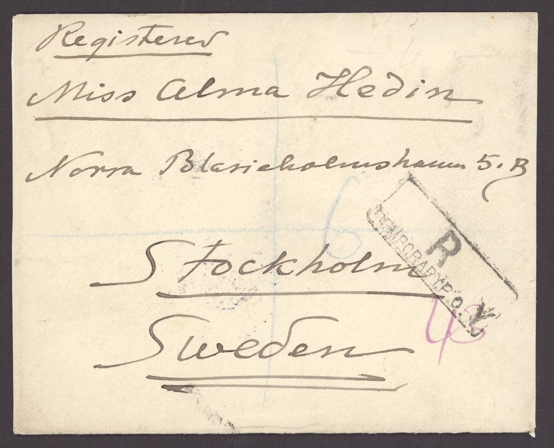 1907 (7 June) opened-out envelope registered to Miss Alma Hedin in Stockholm bearing, on the reverse, India K.E.VII 4a. tied by "