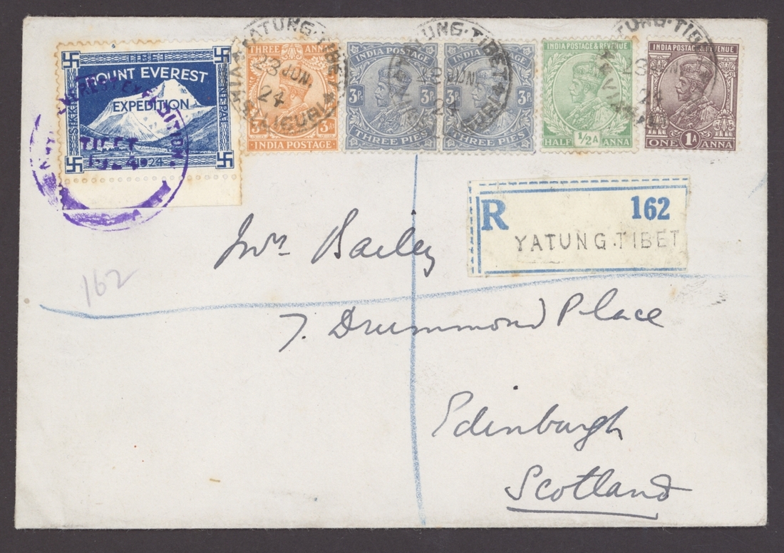 Tractor Party (type A): 1924 (23 June) Bailey envelope registered to Edinburgh bearing the Expedition label (with lower margin) tied by a fair strike of the Tractor Party handstamp in violet, used with India K.G.V 3p. (2), ½a., 1a. and 3a. tied by "