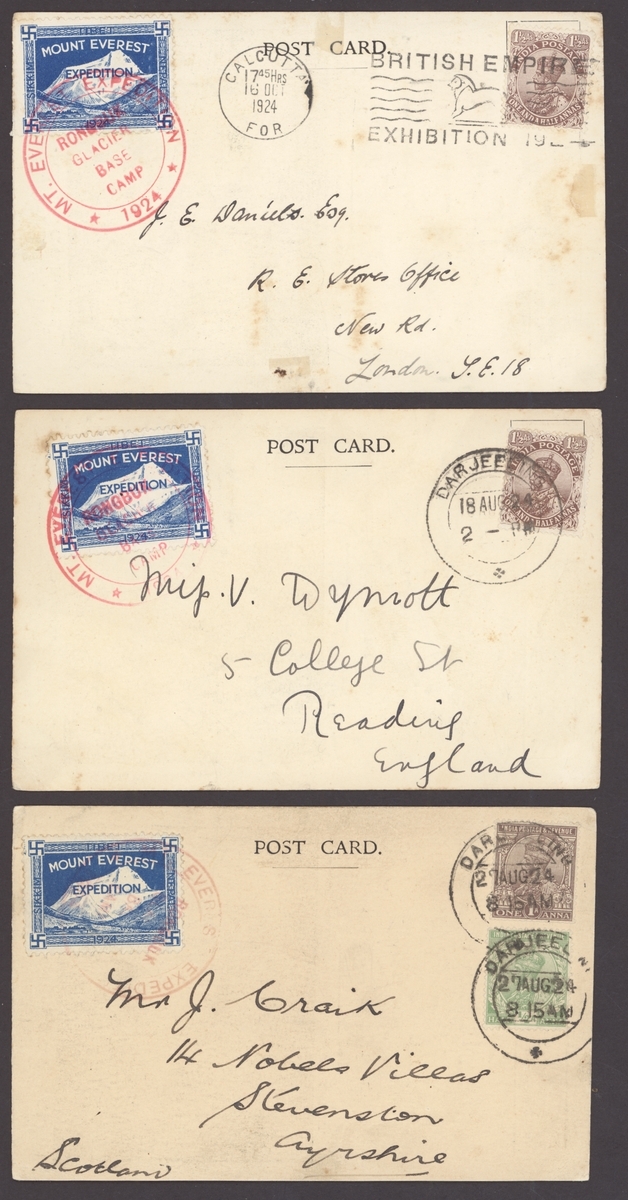 Type D, Rongbuck Glacier: 1924 (Aug.- Oct.) Expedition souvenir cards to England or Scotland bearing India 1½a. franking tied by either Darjeeling c.d.s. (2) or Calcutta British Empire Exhibition slogan postmark, with the Expedition label tied by the type D postmark in red; good to fine. (3 cards)