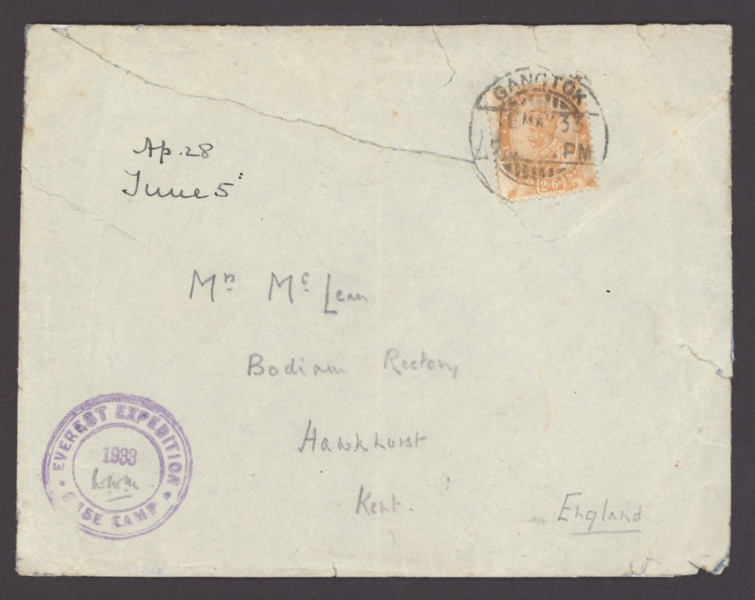 1933 (May) envelope to Hawkhurst, Kent bearing India 2a.6p. tied by Gangtok c.d.s. (16.5) and bearing a good strike of the expedition handstamp at foot, initialled by Dr W. McLean (second medical officer); repaired tear and creasing. Photo