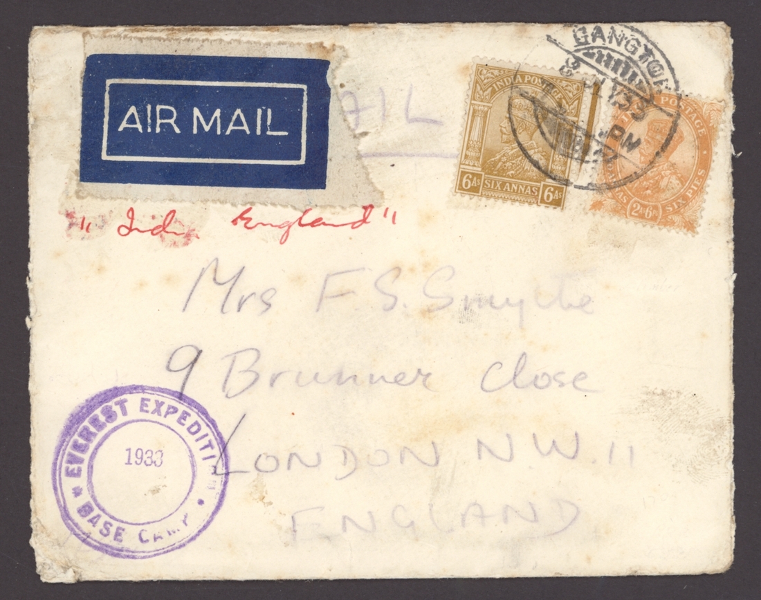 1933 (July) envelope from F.S. Smythe (mountaineer) to his wife in London, sent air mail and bearing India 2a.6p. and 6a. tied by Gangtok c.d.s. (8.7) with a good strike of the Expedition handstamp in the lower corner and bearing an unusual Air Mail label, the reverse bearing a fine strike of "