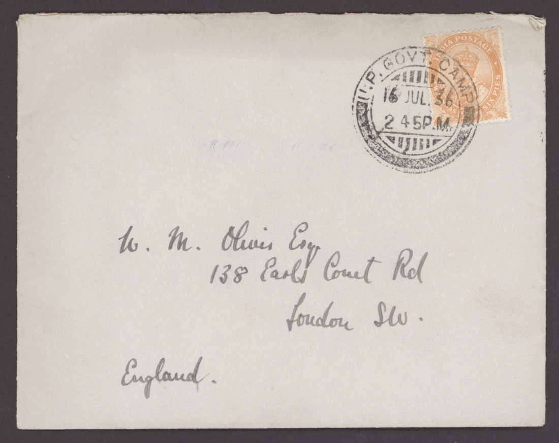 1936 (16 July) envelope from Peter Oliver to London bearing India 2a.6p. tied by a fine strike of "