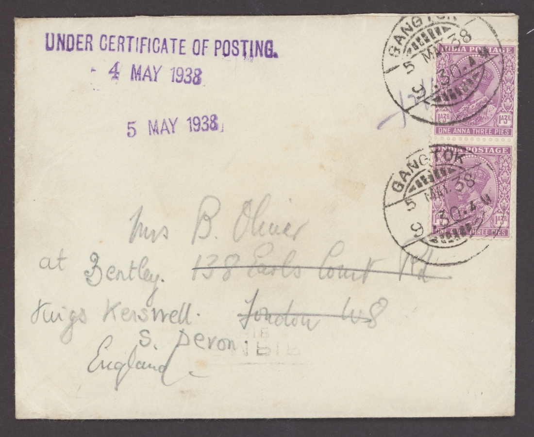 1938 (4 May) envelope from Peter Oliver to his mother in London bearing fine strikes of "