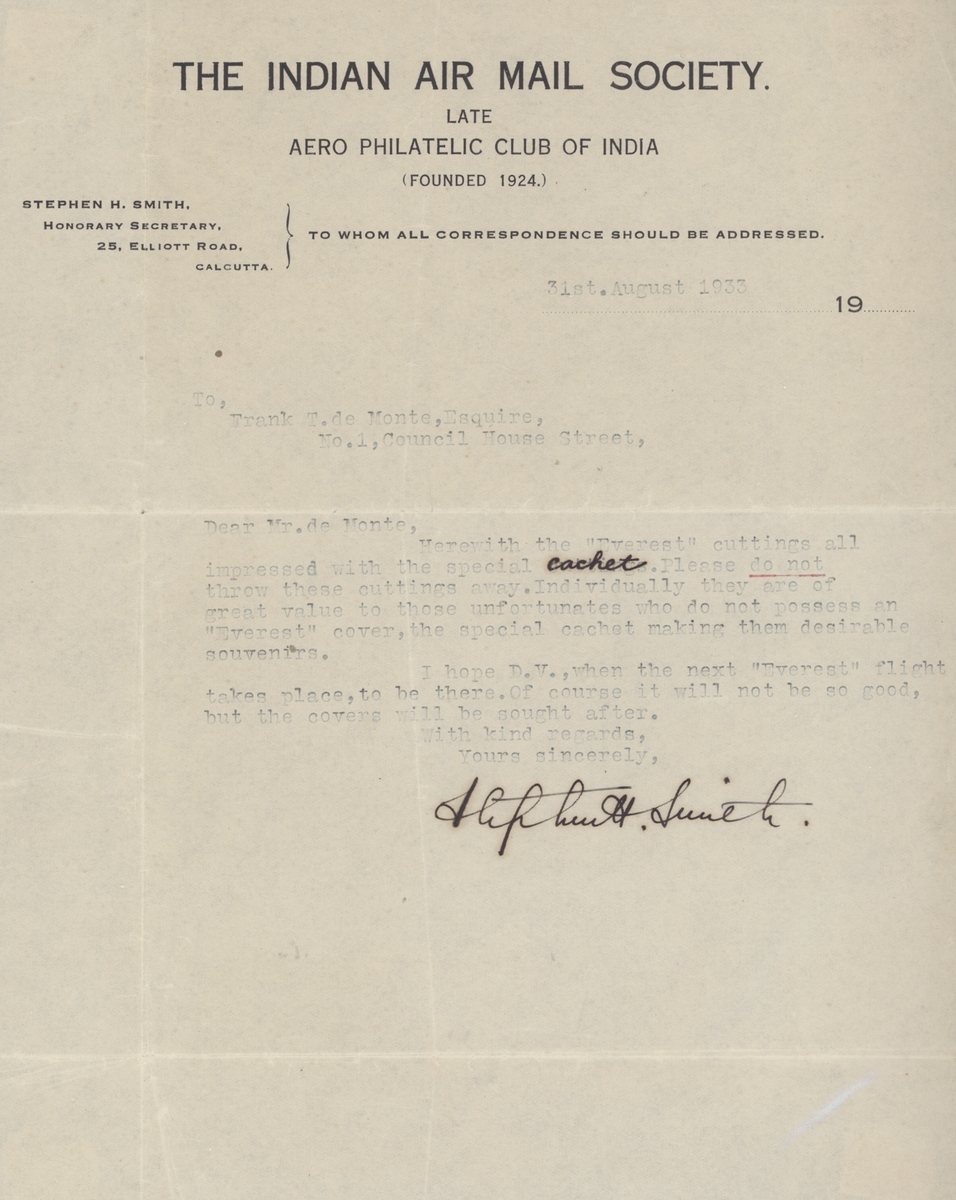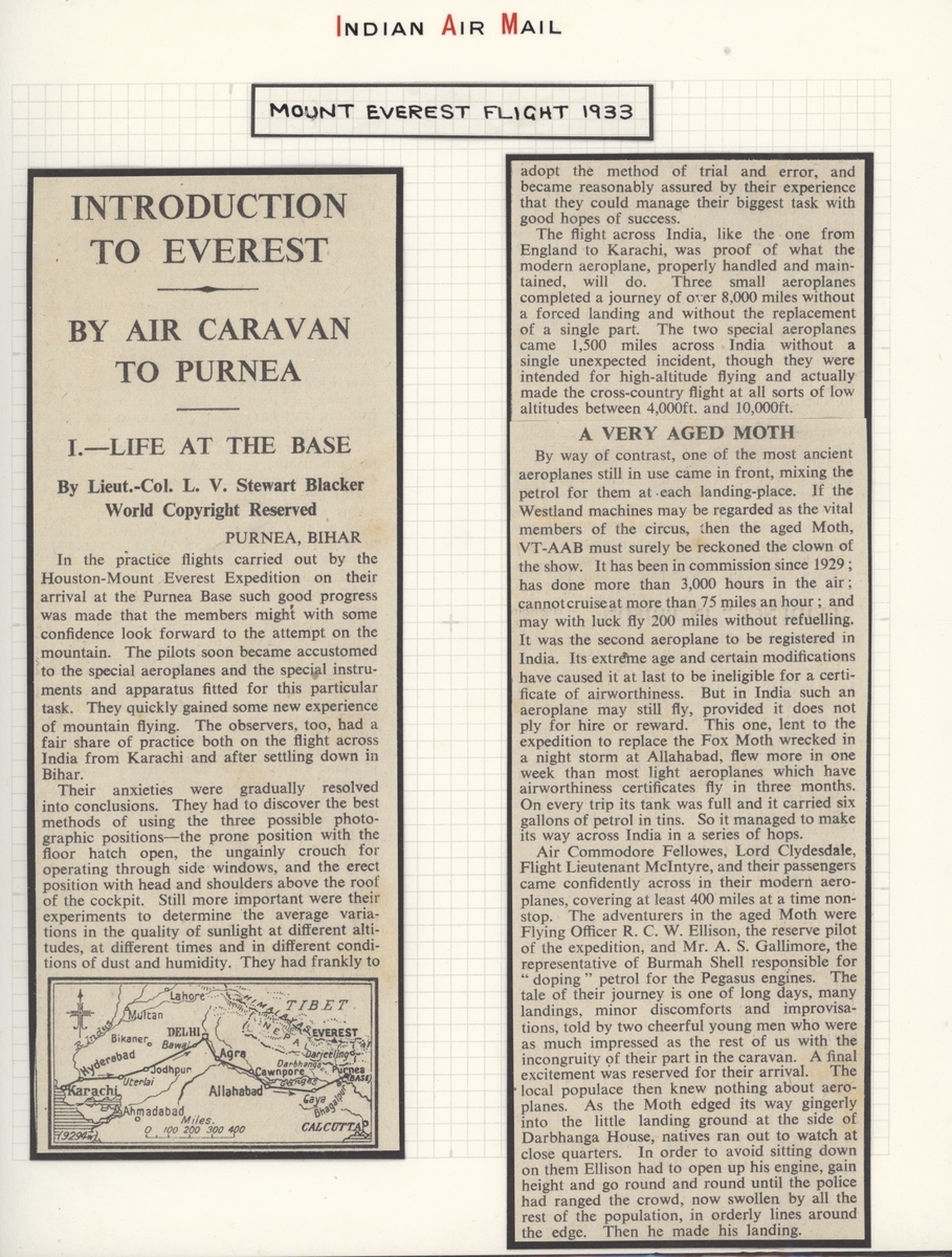 Indian Air Mail Society Mail: A small group with a covering letter from Stephen Smith regarding a group of newspaper cuttings, some bearing the illustrative handstamp struck in purple, an address label to Gaumont-British Picture corporation and a Stephen Smith cover front bearing the coloured label tied by the illustrative handstamp and marked "Mt. Everest Flyers Base" with boxed "