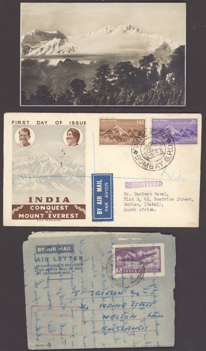 A small group with a 1934 real photocard of Kinchinjunga with the message, "Have just returned from seeing Everest and Kinchinjunga. After much consideration we decided that we would postpone climbing the mountain until we had more time..."; a 1953 air letter from A. Gregory before the assent and includes, "...Everest looks good. The north face is amazingly free of snow... " and bears a light strike of the boxed "