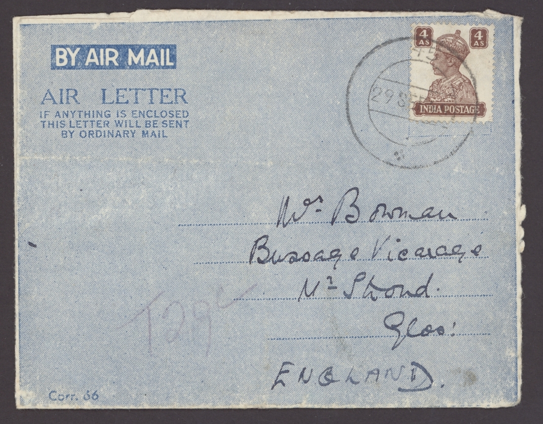 1945 (29 Sept.) air letter sent to England bearing India K.G.VI 4a. tied by a good strike of the large double-circle "45" c.d.s. with four dots at foot; The sender, R.J. Galtine was stationed at the British Mission in Gyantse, though this was written in Lhasa; unusual. Photo