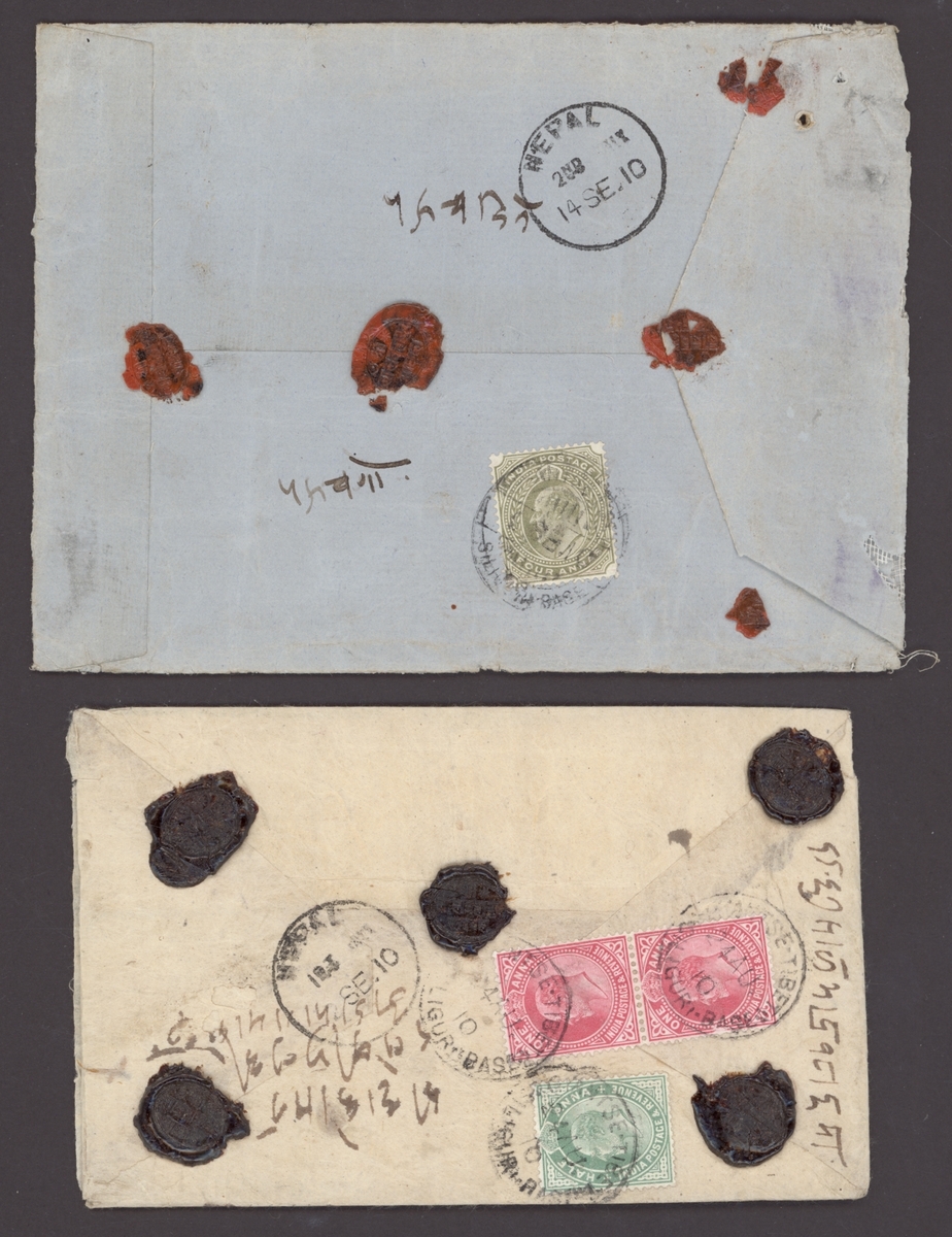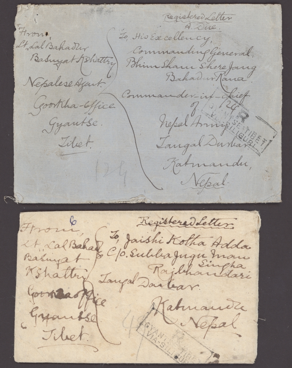 1910 (Aug.- Sept.) two registered covers from the same correspondence from Lt. Col. Basinyat Kshattry to Katmandu, each bears on the address side a good strike of the boxed "R/
