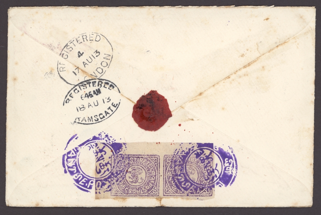 1913 (22 July) envelope registered to Kent bearing India K.E.VII 1a. (3) tied by "