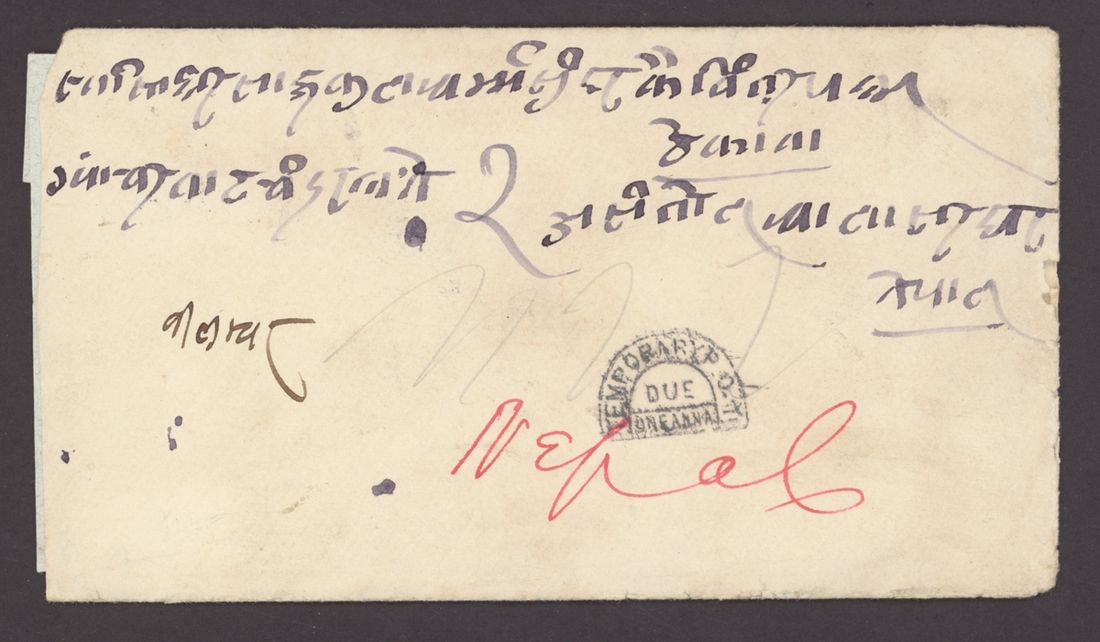 1914 (21 Mar.) stampless envelope to Nepal bearing a fine strike of horseshoe "
