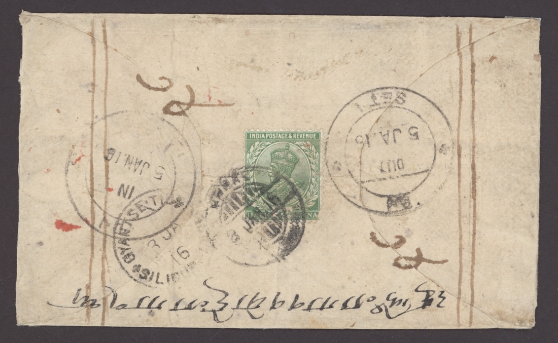 1916 (3 Jan.) envelope to Gyantse bearing, on the reverse, India K.G.V ½a. tied by double-circle Nepal c.d.s., sent by railway and receiving the large, double-circle "SET 1" c.d.s. (15.1) for both "IN" and "OUT" with Gyantse type B1 arrival c.d.s. Unusual. Holcombe opinion (1993). Photo